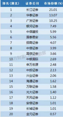 本地券商长江证券在湖北以21%的份额占据排行榜首位,华泰证券和广发证券也以超过10%的份额进入前三。