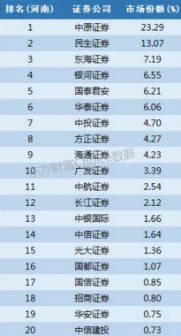 中原证券是河南本地券商,占据市场份额23%,民生证券在河南具有较大的布局,市场份额也比较高为13%。