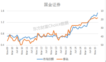 2010年以后的数年熊市间同信证券没有太多进步,甚至在整个从2014年开始的牛市中增长也很缓慢,直到东方财富全资收购西藏同信并且开始有业务推进以后,互联网魔力开始显现,短短半年间,同信证券市场份额飞速增长,排名也稳步上升,从图形看斜率非常惊人。