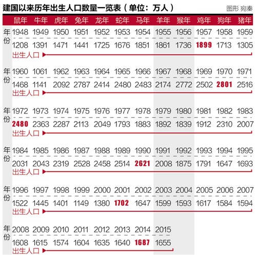 再看一下最近一轮生肖轮转中各年的出生人口:2003年(羊年),1599万人;2004年(猴年),1593万人;2005年(鸡年),1617万人;2006年,(狗年)1584万人;2007年(猪年),1594万人;2008年(鼠年),1608万人;2009年(牛年),1615万人;2010年(虎年),1574万人;2011年(兔年),1604万人;2012年(龙年),1635万人;2013年(蛇年),1640万人;2014(马年)年,1687万人;2015年(羊年),1655万人。
