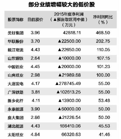 剔除停牌及ST股,有13只低价股去年净利润达到亿元以上且净利润增幅在40%以上。如股价为3.96元的美好集团2015年实现净利润4.28亿元,较2014年翻了4倍;预计2015年实现净利润2.25亿元,较2014年翻了两倍的华联股份,最新收盘价为3.70元。另外,皖江物流、山东钢铁、中国铝业、山鹰纸业2015年度净利润均在亿元以上,且净利润翻倍增长。这些2015年年报大幅预增的低价股较易受到资金的青睐,有望成避风港。