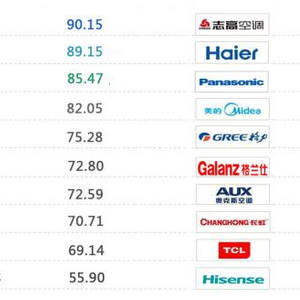 综合消费者对各品牌评价的负面信息量在十大品牌负面信息总量的比重,以及各品牌负面信息量在自身信息总量中的占比等数据进行综合评价,网络口碑表现从好到差依次为志高(90.15分),海尔(89.15分),松下(85.47分),美的(82.05分),格力(75.28分),格兰仕(72.80分),奥克斯(72.59分),长虹(70.71分),TCL(69.14分),海信科龙(55.90分)。