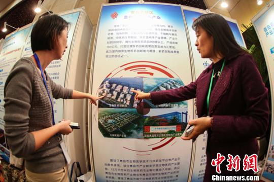 总投资达127亿元的36个新兴产业项目21日晚集中签约落户青岛高新区(红岛经济区),图为签约仪式现场北京企业代表询问该区域投资情况。 青岛高新区供图
