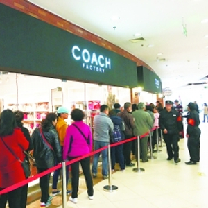 北京商报记者昨日不到10时进入燕莎奥特莱斯,此时,COACH门前已排起长龙。根据现场观察,门店为应对蜂拥而至的消费者采取限流措施,仅排队等候进门就需要40分钟。据一位店员介绍,很多款3月21日就已售空,服饰和女鞋号码早已不全。