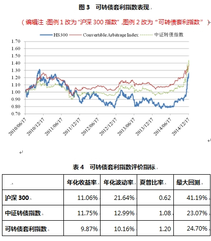 将计算出的可转债套利指数与沪深300指数中证转债指数进行对比(见图3),发现可转债套利指数的年化波动率为10.16%,远低于沪深300指数的波动率,比中证转债指数波动率也低近3个百分点。更为重要的是,从夏普比率来看,可转债套利指数的风险调整收益要高于沪深300指数和中证转债指数,可转债套利指数的夏普比率是沪深300指数的近两倍。