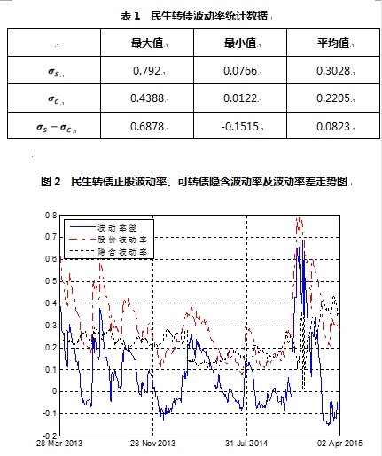 从表1和图2可知,民生转债正股波动率波动剧烈,可转债隐含波动率相对平稳,波动率差主要由正股波动率决定。