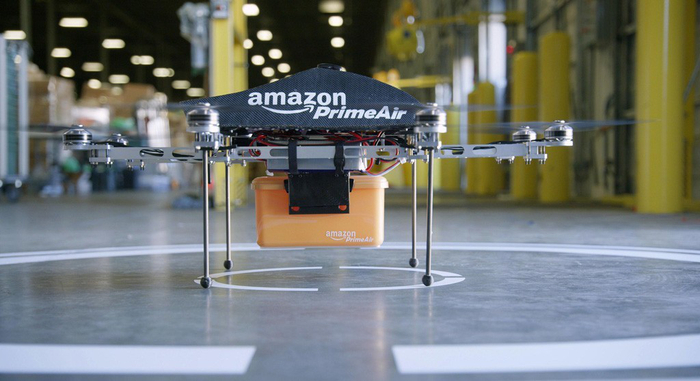 亚马逊正在做的一件事是无人机快递服务(Amazon Prime Air)。当仓库员工将商品装入一个类似午餐盒的黄色箱子后,便由传送带及机械手臂自动装载于无人机上,通过平板电脑即可控制无人机,无人机从仓库起飞,在客户家门口着陆后卸下货物。