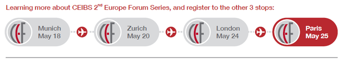 错过这次游学也没关系,5月,中欧国际工商学院欧洲论坛将在慕尼黑、苏黎世、伦敦和巴黎进行,话题涵盖了工业4.0和中国制造、中国与欧洲之间的商业机遇、人民币国际化与中国金融创新、中法商业机遇。报名请咨询: