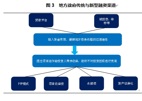 随着地方政府万亿元债务置换的开展,地方政府融资的各种明渠暗道将呈现此消彼长的发展态势。一方面,传统融资方式能融入的资金有限,如通过贷款平台、城投债、非标等方式进行融资,更多只能作为缓解地方政府债务问题的过渡途径。另一方面,43号文的颁布带来PPP模式的推进和其他创新品种的展开,包括项目收益债、永续债和资产证券化(见图3)。这些方式在地方政府融资过程中以政府为主体引进社会资本,同时通过项目运作给投资人带来收益,政府参与融资但不对债务兜底,如果运行成功则能有效缓解地方政府的债务问题,同时也能够募集到所需要的建设资金。