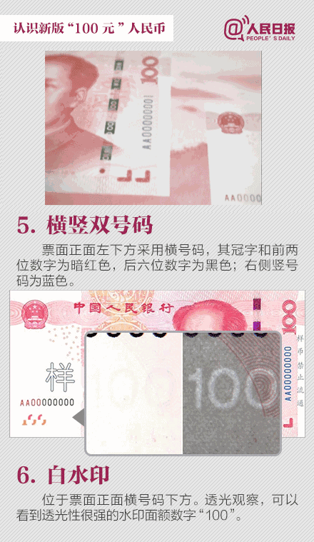 ①看光变镂空开窗安全线;②看光彩光变数字;③看人像水印;④看胶印对印图案;⑤看横竖双号码;⑥看白水印;⑦看雕刻凹凸。扩散!