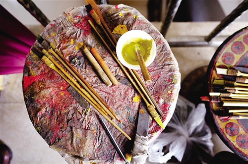 外光明大道上,有一栋窄仄的五层小楼,那是吉伍巫且的“工厂”,也是他的家。他在不同楼层里开辟出画室、阴干室、调漆室等,自己和妻子住在四楼。“工厂”聘请了十来个吉伍家支的男人,但并没有任何管理制度,他们有空就来,随时可以走,巫且按制作的漆器数量支付一定的报酬。