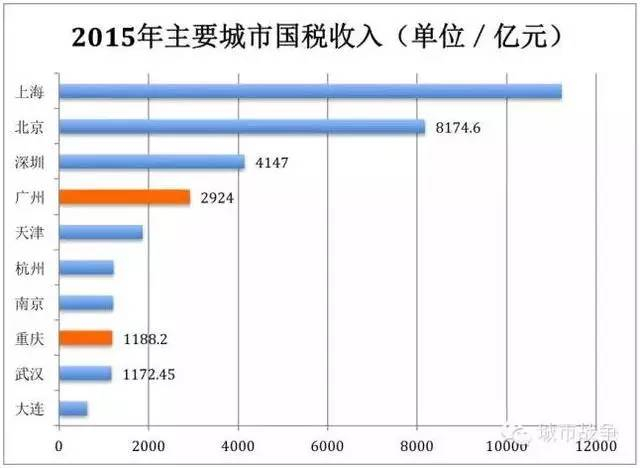 说回广州,广州国税部门(不含地税部门)2015年征收的税收总额达2924亿元,大约是深圳的70%,但地方财政收入只有后者的50%;大约是重庆的2.5倍,但地方财力只有后者的62%;大约是武汉的2.5倍,但地方财力只比后者略微领先。