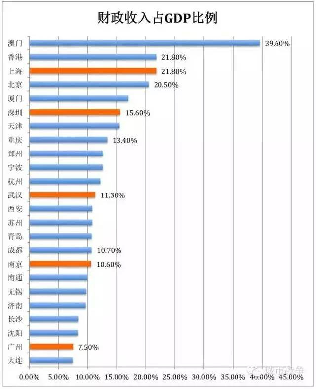 如图,若论财政收入与GDP的比值,广州在主要城市中,排到倒数第二,仅微微领先于大连。