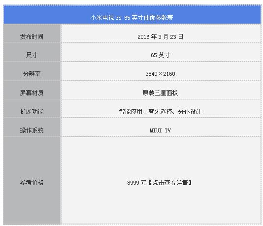 总结:小米电视3S 65英寸曲面拥有时尚大气的外观设计,高品质曲面大屏、薄至5.9mm的金属机身、简约流线型金属底座等等,处处都彰显品质。内容方面采用GITV、爱奇艺等四大牌照方资源,内容丰富,各种美剧、韩剧、电影、综艺节目更新速度快,完全满足日常需求。同时小米电视3S 65英寸曲面的画质也达到了较高的水准,广色域加出众的黑场表现带来了视觉上前所未有的震撼,尤其是在观看超高清电影的时候,大屏让观看者更容易沉浸其中,这也是以往电视所难以企及的。最后,8999元的价格对于一款高端65英寸的4K大屏电视来说也比较超值,如果你确定要买一款大屏的曲面电视,小米是最好的选择。