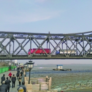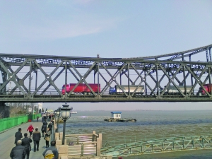 3月28日,丹东市的户外最高温度只有12℃,鸭绿江畔似乎更冷一些,江边路上的很多商贩都穿着厚厚的棉衣。或许是因为天气的原因,作为该市的著名旅游景点,鸭绿江断桥附近的游客并不是很多,商贩数量甚至超过了游客。面对数量有限的游客,这些商贩并没有懈怠,依然在卖力地兜售着朝鲜的香烟、钱币、邮票和工艺品。