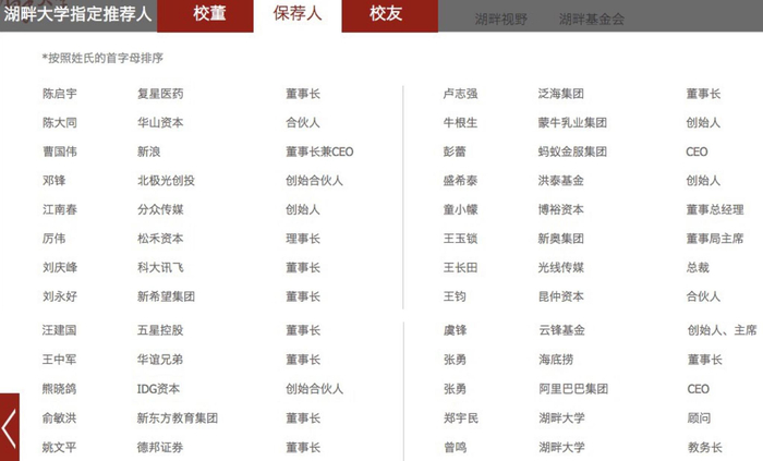 4保荐人制度是个什么鬼?混不进推荐人朋友圈?那你洗洗睡吧从湖畔大学官网公布的指定推荐人名单来看,包括9名校董、26位保荐人以及第一期的所有学员。