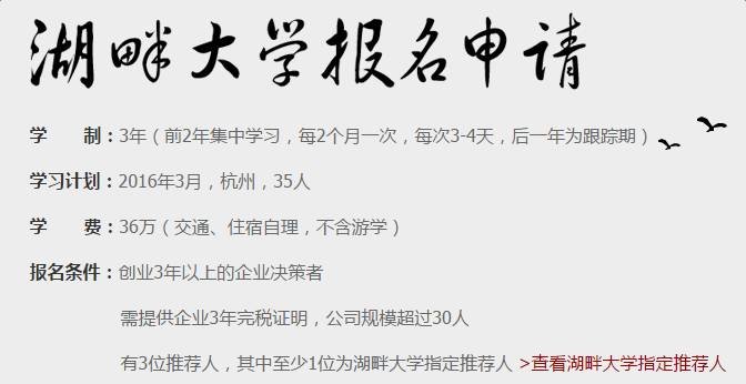 从湖畔大学2016年的招生介绍来看,你首先必须是创业3年以上的企业决策者,还得提供企业3年完税证明,公司规模超过30人。