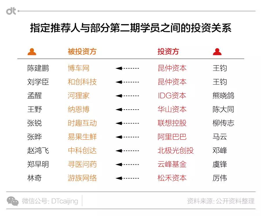 既然保荐人中不乏专业投资人,DT君稍微考察一下他们和学员之间血缘关系——不完全统计,至少9名学员的企业直接接受了几位保荐人所在投资机构的入股。
