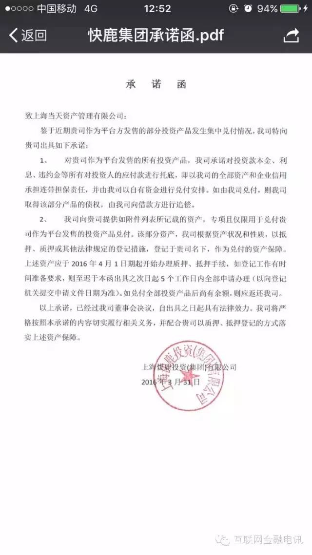 同时,一张疑似快鹿集团官方向当天财富主体“上海当天资产管理有限公司”承诺保底的承诺函在4月1日流出。该承诺函中表示快鹿集团将对投资人应付款进行托底,兑付资产将于2016年4月1日起办理质押、抵押手续。最后盖有快鹿集团的公章。