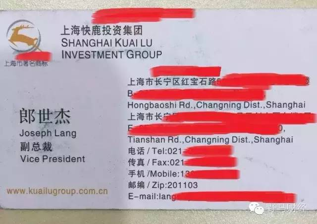 4月2日,据野马财经报道,一张知情人向野马财经提供的名片显示:知名经济学家郎咸平的儿子郎世杰的头衔为“上海快鹿投资集团副总裁”。