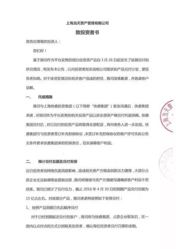 兑付方案表示,经当天财富与快鹿集团沟通后,快鹿集团承诺,对当天财富平台发售的相关投资产品以其全部资产做兑付托底保障。