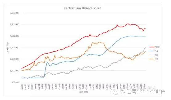 然后哥又看了下世界几个央行的资产负债表(红线为中国,蓝线为美国)
