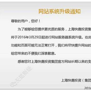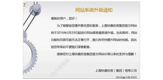 ▲ 金鹿财行总公司快鹿集团的官方网站已无法打开,官方声明为系统升级,但就官网恢复时间并未做出公示。