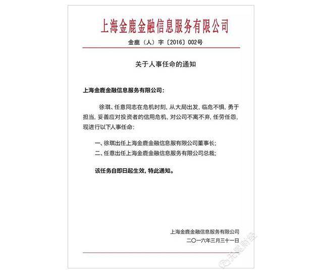 ▲ 金鹿财行3月31日发布了一则人事任命通知,徐琪、任意接任董事长、总经理职位,但随即删除了该通知。