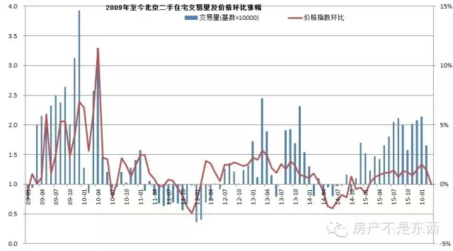 对普通购房者而言,看指数可能不那么直接,但能搞清楚房价的整体涨跌情况。其实还有个指标可能比较直接,那就是二手房成交量。与新房不同,二手房成交量跟供应量、可售量(也就是开发商推盘)基本无关,也不容易受推盘结构的影响,2009年来的数据表明,1万套是北京房价的敏感值,交易量持续超过1万套超过后房价上涨可能性很大,反之亦然。比如2010年7月-8月,2011年4月,2014年4月等几个时间点,都是在成交量降至1万套以后出现房价阶段性调整。