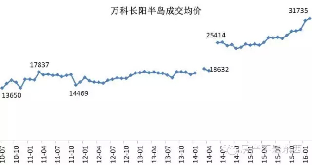 再举一个例子就能看的更清楚,万科长阳半岛,2010年7月首次开盘,当月均价13650元/平米。作为近郊区房山的第一个大盘,2010下半年曾多次开盘并次次日光,创造了当年的销售记录。2016年初,其最新成交均价超过3万元,有报道说即将开盘的新产品,报价将达3.7万元。但从各个月的数据看,2013年至2014年4月,均价在18000元左右波动(多个月成交量不足10套)。但2014年6月跳涨至25000元以上,之后半年稳中有跌,从2015年4月开始持续上涨至目前的30000元以上。
