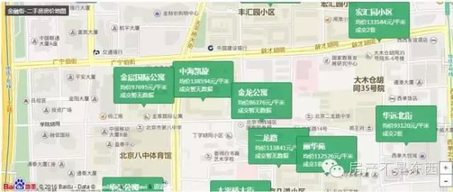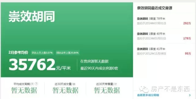 但需要注意的是,在我们讨论具体楼盘的价格时,均价很容易走偏。比如前面说的西城区,目前价格最低的商圈是“白纸坊”,目前均价47750元,过去一年涨幅19.09%,看起来没啥问题。细看发行,该区域有个均价看起来很低的小区崇效胡同,均价仅35762元,仅为西城区房价的一半,比整个北京的均价还低,几乎可以断定这个价格不准确。最后发现,这个小区在链家系统里仅有三次成交,分别在2012-2014年,单价在2.3万到4.3万之间不等,也就是说这个价格近两年没有更新。