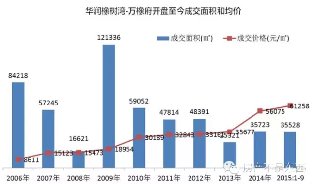 2015年,有一个卖了超过10年的项目,海淀区的“神盘”华润万橡府(之前叫橡树湾),从2006年开盘之初的8000多元,涨到2015年的超过6万元,更2009年相比涨了两倍以上,这个涨幅应该跟大家的感受差不多,但依然有不准确的地方。比如2008年,普遍感觉房价有下跌,但橡树湾均价仍有小幅上涨;2009年,普遍感觉房价涨幅很大,但全年均价仅小幅上涨3000元;2010年,市场有波动,但房价从前一年的18954涨到3万+,涨幅约70%。这个例子进一步证明了均价在某一时期的波动,不一定能准确反映交易量。