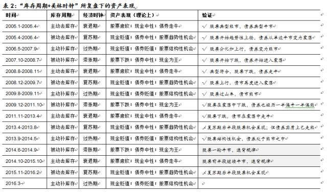 上面我们介绍了用库存周期做t-7期递推的方法;在这里,我们用另外一种方法去做推演,并用历史数据做出复盘验证。我们用库存周期去递推美林时钟(而不用美林时钟的GDP和CPI的方法,在GDP长趋势下行周期中,GDP上行区间比较少),用美林时钟递推大类资产在理论上的表现,然后用实际表现去做验证。