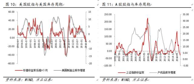 从经验数据来看,美国股市一般领先于库存周期6个月左右的时间;A股(上一轮牛市期间数据排除)领先于库存周期7个月左右的时间。