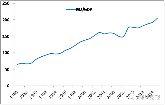 近年我国货币供应增长较快,但经济增速却不断下降,金融与实体之间背离日益扩大。2014年M2增长12.2%,GDP增长7.3%,2015年M2增长13.3%,GDP增长6.9%,2016年1-2月M2增长13.3%,预计1季度GDP增长6.5%左右,1月新增人民币贷款2.51万亿元,1季度预计4.3万亿元左右,广义货币供应和名义实际GDP增速的裂口不断张大,超发货币未流入实体经济,落入流动性陷阱。M2/GDP已快速攀升至205.7%。