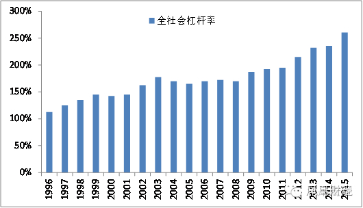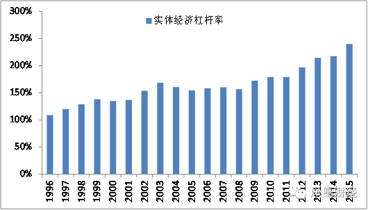 通过累加政府、居民、非金融企业三个部门的债务,截止2015年底,中国实体经济的债务规模为162.3万亿元,实体经济杠杆率为239.8%。从中我们可以看到2008年金融危机之后,中国实体经济的杠杆率出现了快速上升,2008-2015年期间猛增了82.8%。