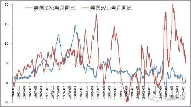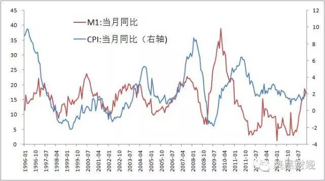 从波动幅度来看,历史上1996-2015年M1共出现过5次高速增长,峰值基本相同,在22%左右,但是,同一水平的M1增速,所引发的CPI波动幅度却差别极大。