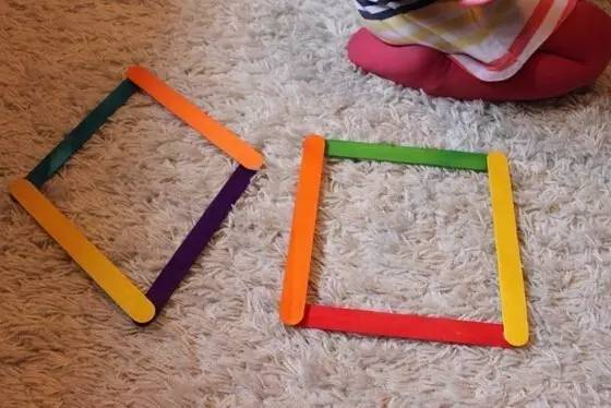 然后,孩子就可以用雪糕棒搭出各种形状了。这个游戏不仅能让孩子们动手,还能动脑,一举两得!