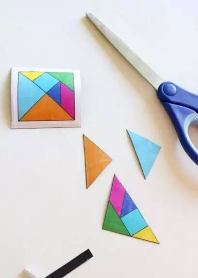 用硬卡纸给孩子做一个七巧板,然后再准备一些对应的形状卡,孩子就能照着形状卡来组合,很方便,也很好用。