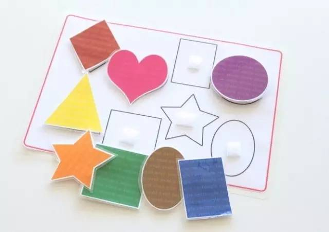 二张卡纸上面需要画上同样的图形,一个仅留有图形轮廓,另一份则需上色,并剪下,让孩子将每种图形放置在对应的轮廓中。