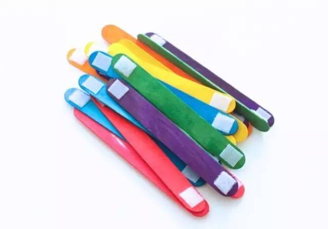将雪糕棒洗干净后,用彩笔等图上不同的颜色,然后在每根的两端固定两块魔力贴。(年龄较大的孩子,可以同时在雪糕棒中间部位的正反两面放置魔力贴)