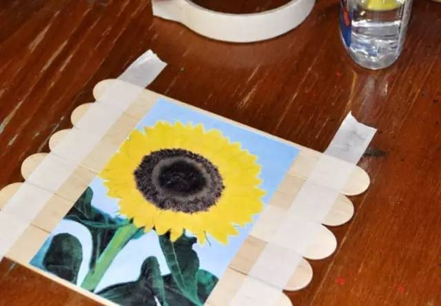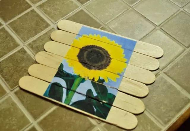 之后根据雪糕棒之间的缝隙将图片裁开,并去掉胶纸,自制的拼图就完成了