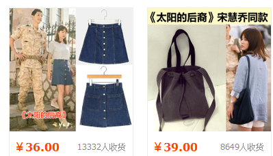 一边是追着看“跟着乔妹学穿搭”,“学韩妞撩汉”的攻略,一边在淘宝天猫上刷刷地搜索同款,目前“太阳的后裔同款”可以在淘宝上的搜索结果已经超过了11万件,乔妹从裙子到包到首饰都成了爆款。
