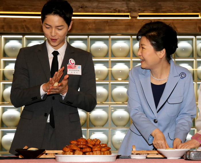 4月11日,宋仲基和朴槿惠出席韩国K-Style Hub饮食文化开馆仪式,来源:CFP