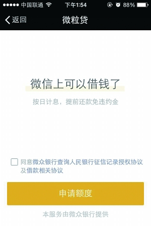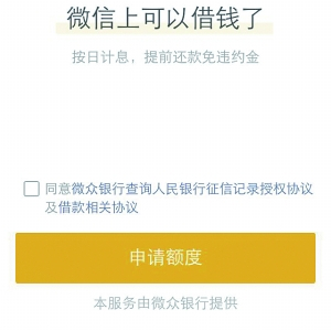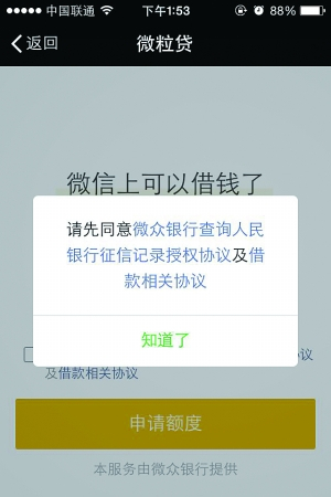 北京晨报记者在手机上点击了“微信”-“钱包”-“微粒贷”,接着出现了“微信上可以借钱了”的页面(图一),继续点击“申请额度”,弹出“请先同意微众银行查询人民银行……相关协议”(图二),勾选后即输入密码页面(图三)。记者邀请了几位同事一起体验,除了一位对产品有了解的同事点击条款查看,其余同事在勾选和输密码的时候表示“有点蒙”。