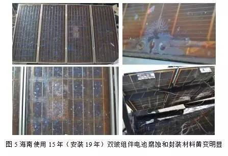 海南是我国典型的热带湿热气候地区,年平均气温22~27℃,年平均湿度超过80%。湿热气候地区具有高温、高湿和强紫外等环境特点,对组件中的电池栅线、焊带、EVA、背板等材料有显著影响,在海南使用的光伏组件普遍存在电池栅线和焊带腐蚀、封装材料变色等问题(如图5),该电站由多个4块组件的独立系统组成,其系统无一例外存在电池片、银栅线和焊带腐蚀问题,户外功率测试设备已测不出电流和组件剩余功率。