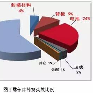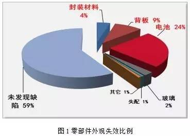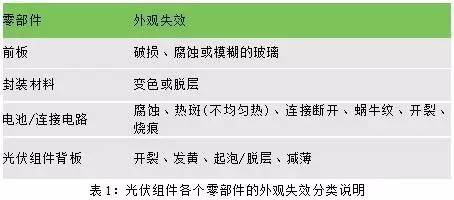 实验室检测主要侧重对太阳能组件材料的化学和物理变化的分析,而户外电站检测主要侧重视觉失效统计。随着太阳能产业的重心从“设计制造”阶段转移至系统的运营和维护,功率输出、安全性能和外观失效日益成为决定光伏系统价值的关键性标识。根据研究显示,所有确认的失效都涉及到光伏组件四大主要零部件中的一个或多个:前板、封装材料、电池/连接电路和背板(见表1)。