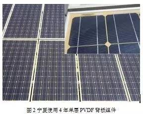 图2是宁夏使用4年的组件,使用的是单层PVDF背板(PVDF薄膜/聚酯PET/粘接E层),背板内层显著黄变,超过50%的同类型组件和背板存在类似问题。背板变色发黄是一种常见的外观失效,根据现场IV测试结果显示:黄变组件的平均功率衰减为11%左右,显著高于户外使用4年组件功率衰减不超过5%的要求。