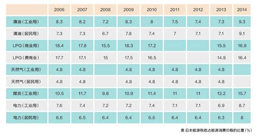 另一方面,日本政府还出台了促进天然气发电的行业税收政策。首先,从能源税收占能源价格比例来看,无论是民用还是工业用天然气,其税收在价格中的比重是很低的(见上表)。煤炭和液化石油气的行业税收水平要远高于天然气和石油。