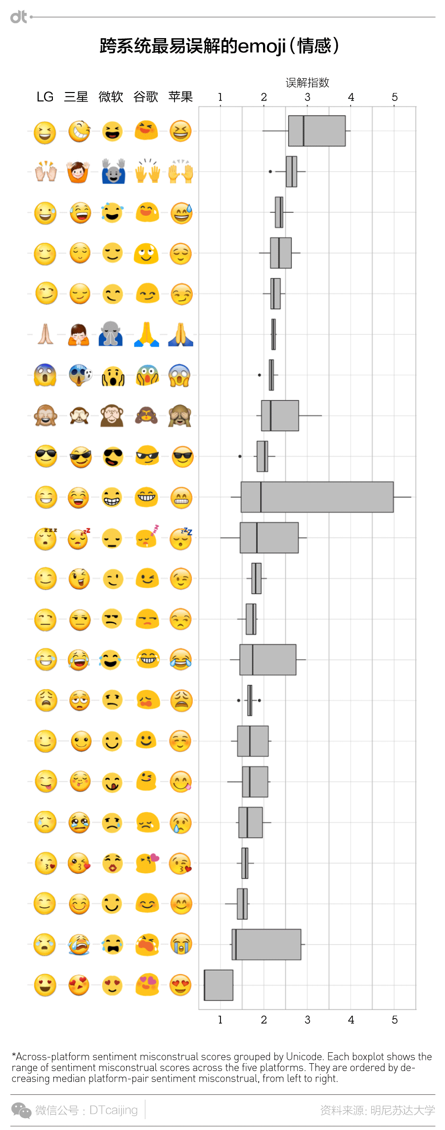 美国明尼苏达大学的GroupLens研究团队近期就对emoji的理解分歧进行了研究。研究者从情感角度与语义角度对这些黄黄的表情们进行了分析。
